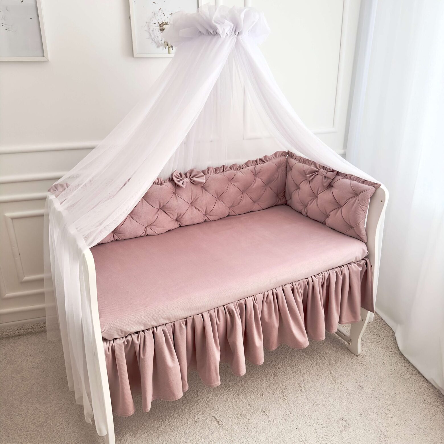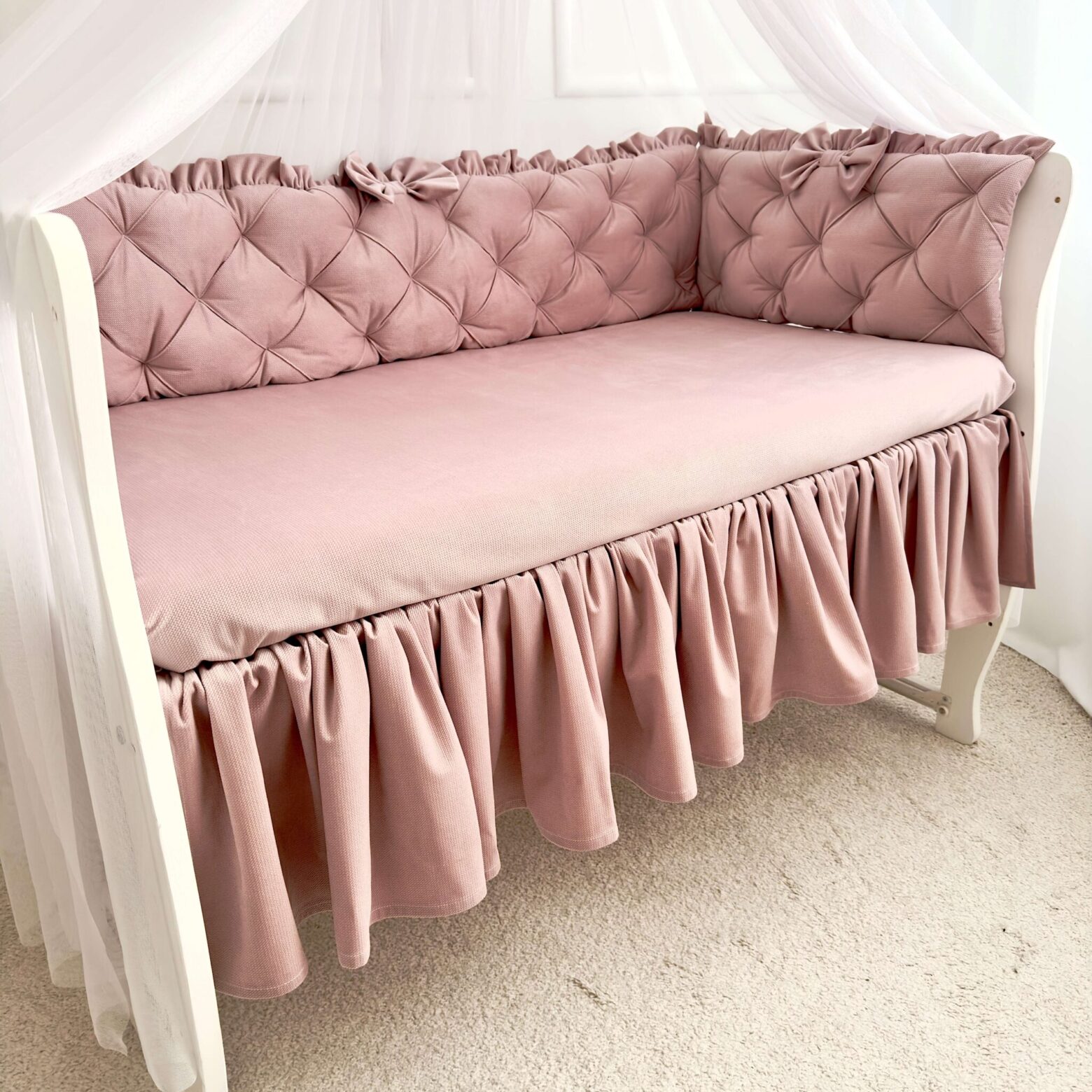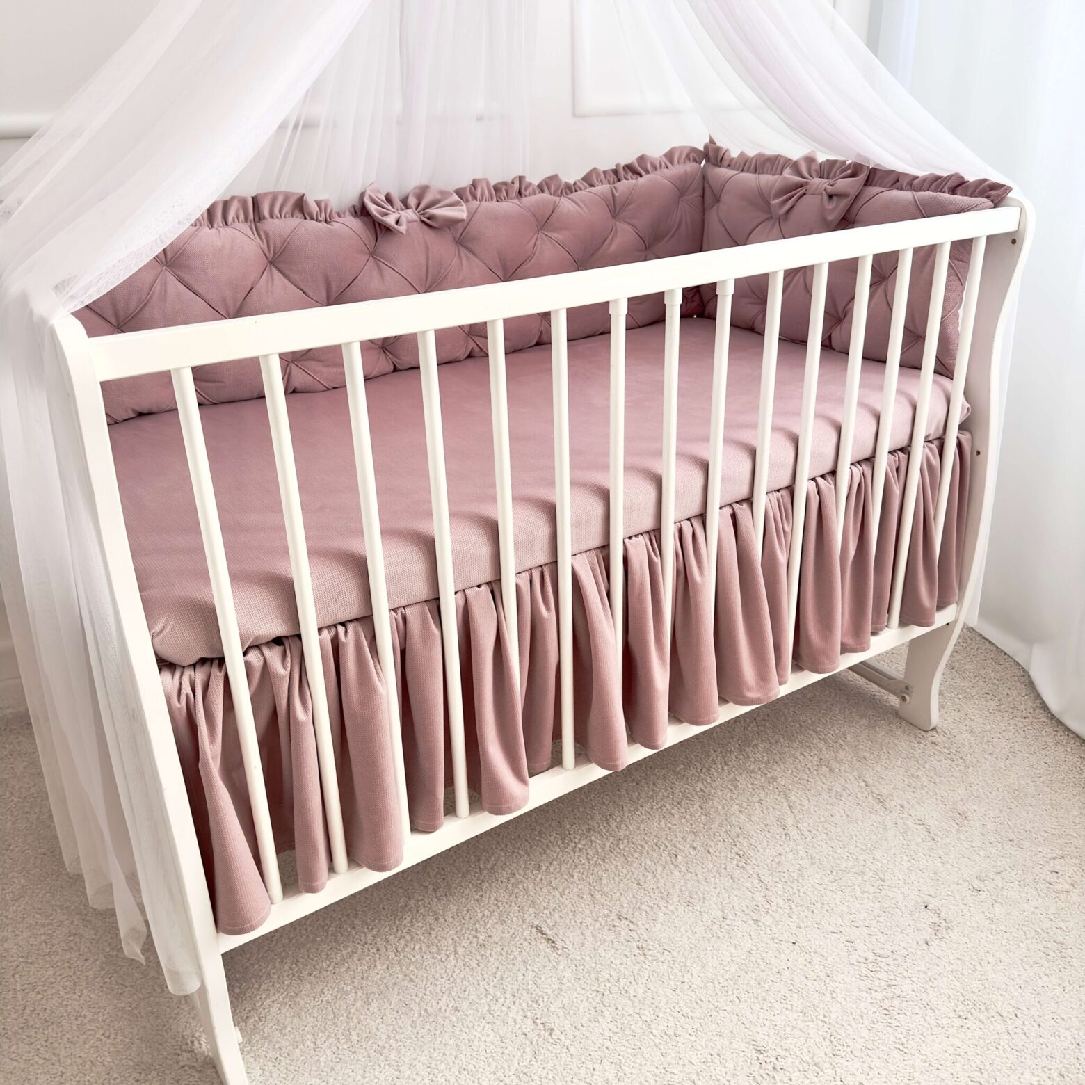 Falbanka maskująca do łóżeczka to wspaniały dodatek do wyprawki waszego maluszka. To bardzo prosty i atrakcyjny dodatek, który zakryje to, czego widzieć nie trzeba, a przy tym ozdobi łóżeczko. Falbana zakładana pod materac, gęsto marszczona, aby pięknie układała się między szczebelkami łóżeczka. Uszyta w całości z mięciutkiego velvetu na wszystkie boki łóżeczka. Dzięki temu możecie idealnie dopasować kolory falbanek do naszych ochraniaczy lub pościeli.
