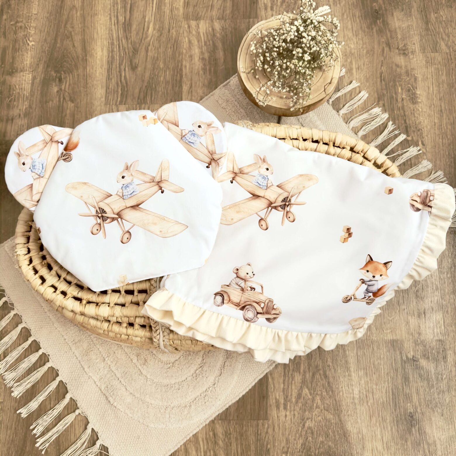 Kołderka + poduszka z wypełnieniem. Kolekcja DREWNIANE POJAZDY + VELVET krem