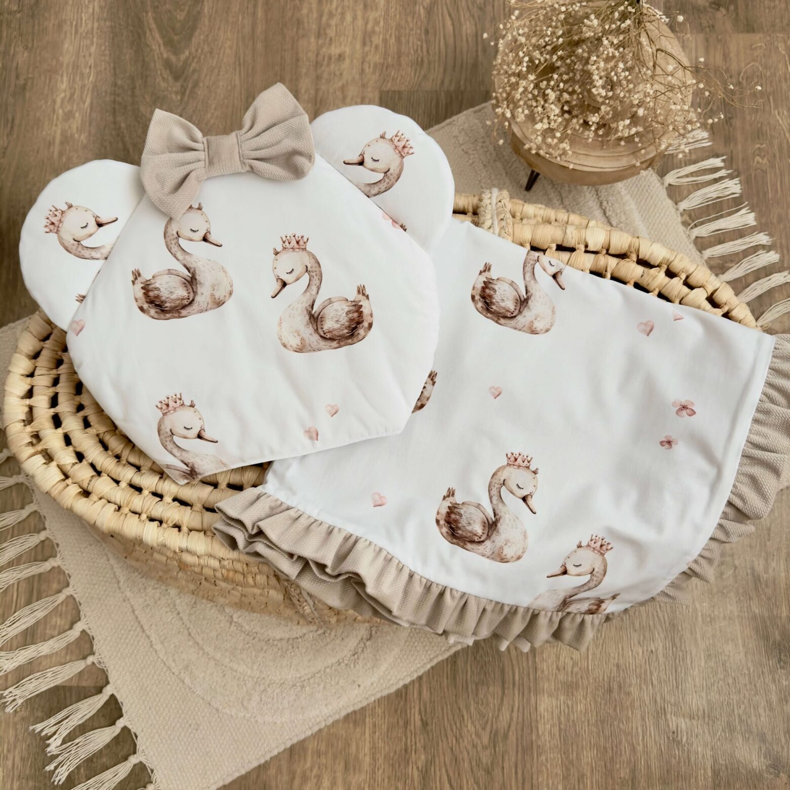 Becik niemowlęcy z kolekcji ŁĄBĘDZIE + VELVET beż