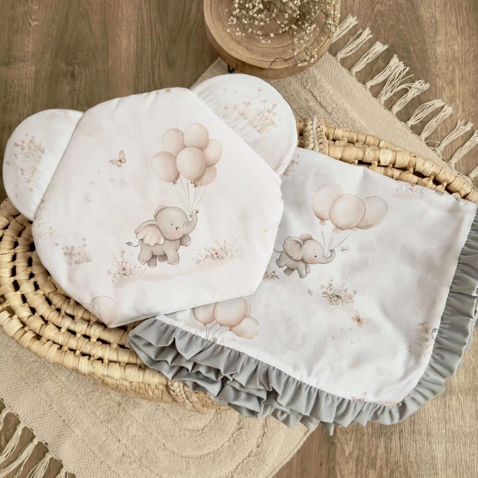 Kocyk + poduszka. Kolekcja WESOŁE SŁONIKI + VELVET szary