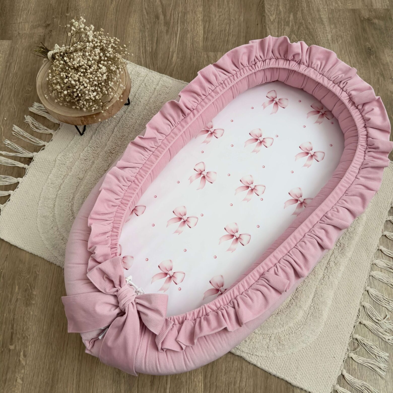 Kokon niemowlęcy z kolekcji KOKARDKI + VELVET róż Darmowa dostawa od 500 zł! Kokon niemowlęcy z kolekcji KOKARDKI + VELVET róż