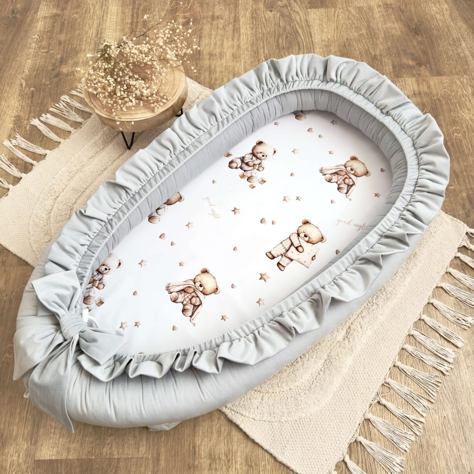 Kokon niemowlęcy – wykonany ręcznie, z najwyższej jakości materiałów z certyfikatami Oeko-Tex Standard 100. Doskonały do: