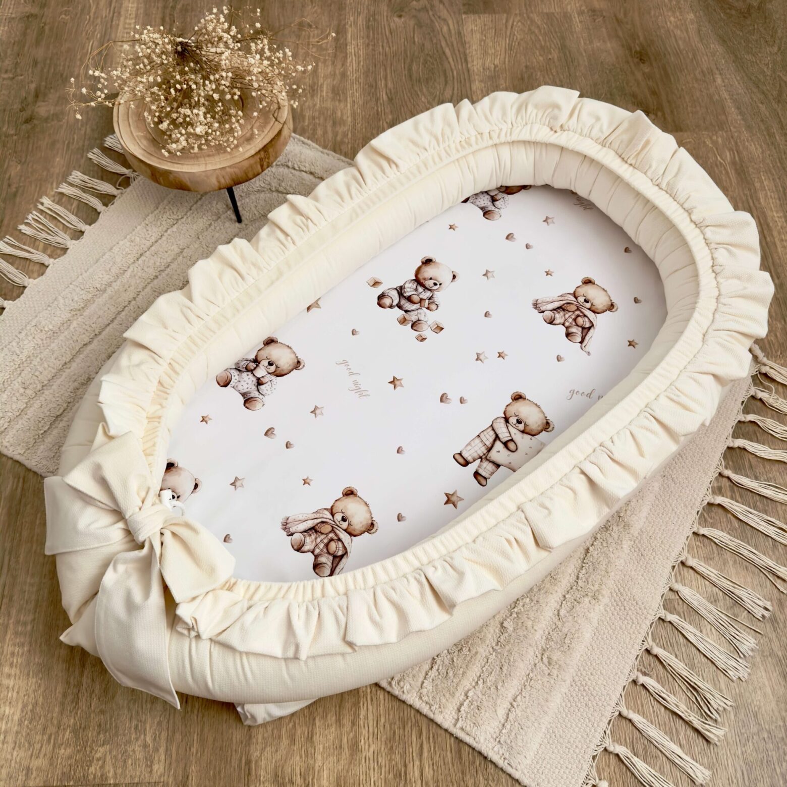 Kokon niemowlęcy – wykonany ręcznie, z najwyższej jakości materiałów z certyfikatami Oeko-Tex Standard 100. Doskonały do: