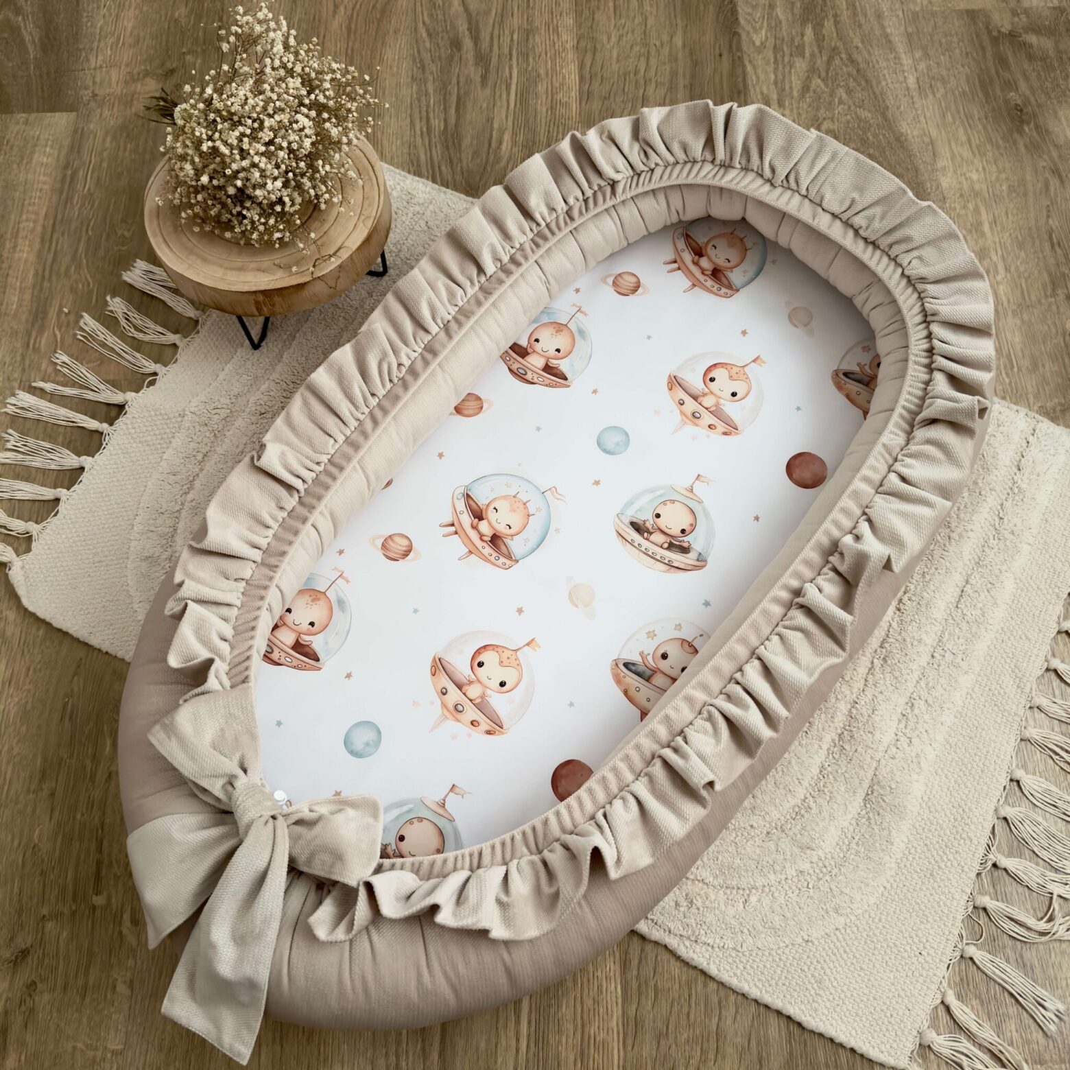 Kokon niemowlęcy – wykonany ręcznie, z najwyższej jakości materiałów z certyfikatami Oeko-Tex Standard 100. Doskonały do: