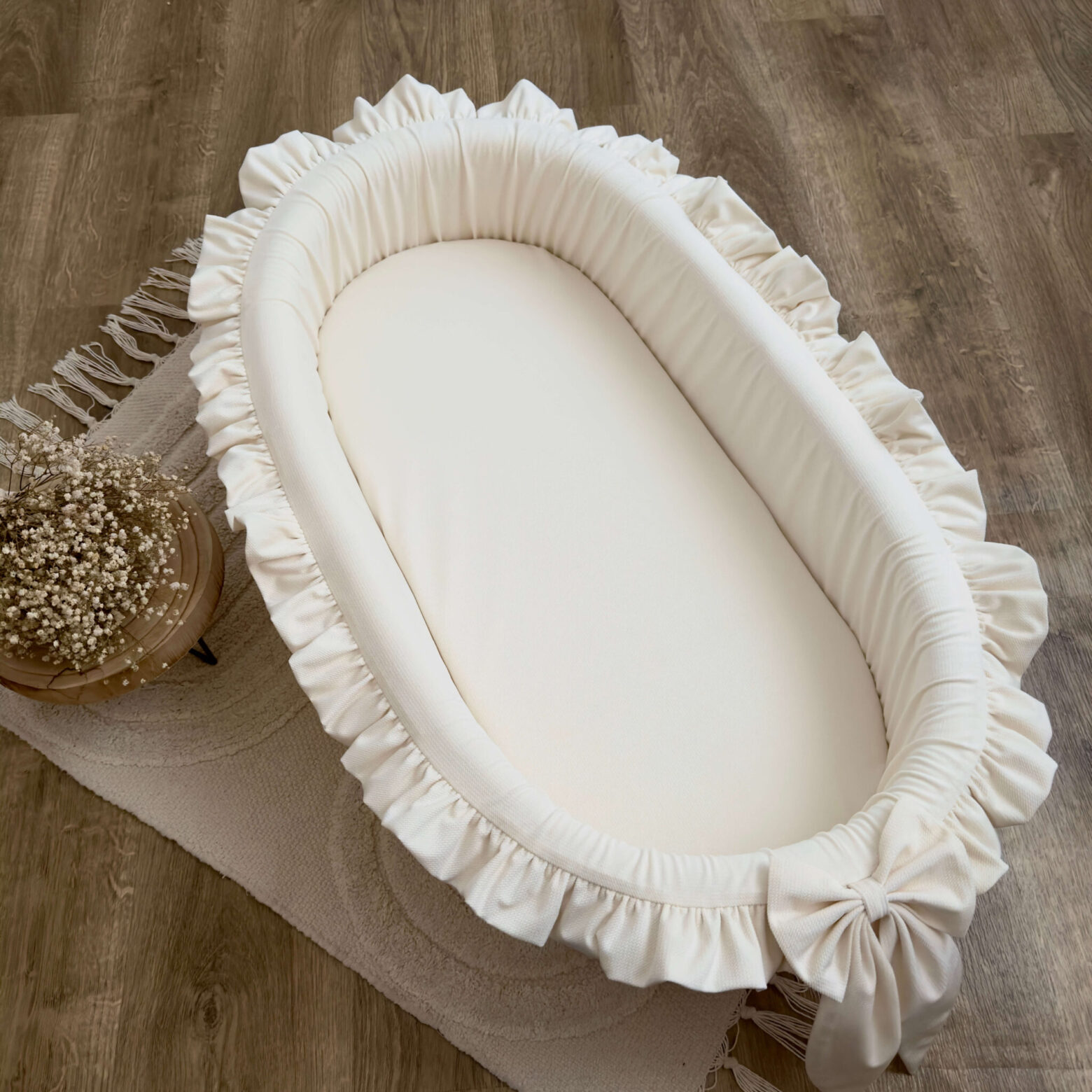 Całość wykończona jest piękną falbanką i ozdobiona uroczą kokardą, co dodaje kokonu wyjątkowego charakteru i sprawia, że wygląda elegancko i delikatnie.