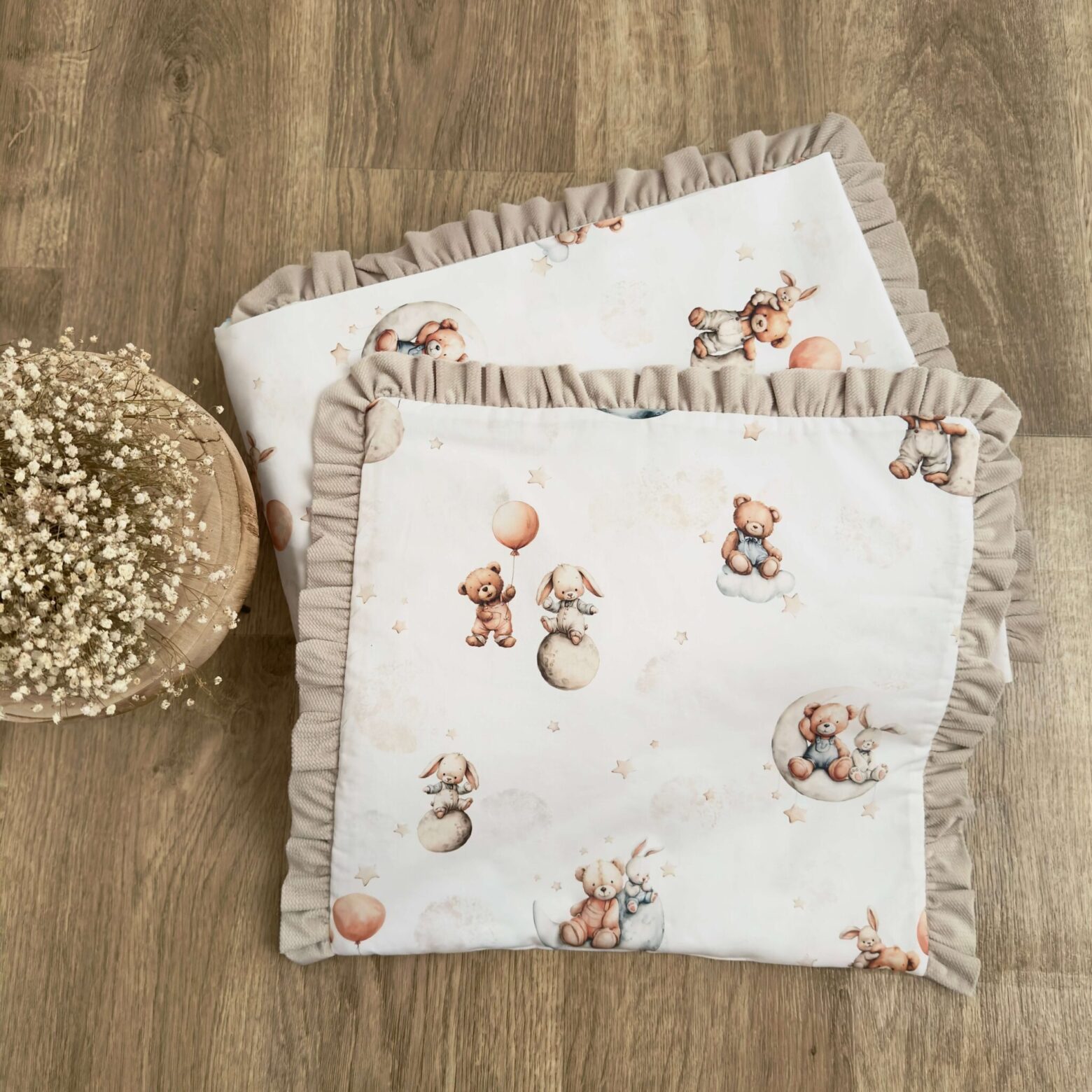 Kołderka uszyta jest z wysokiej jakości bawełny PREMIUM oraz milutkiego w dotyku materiału VELVET całość wykończona delikatną falbanką.