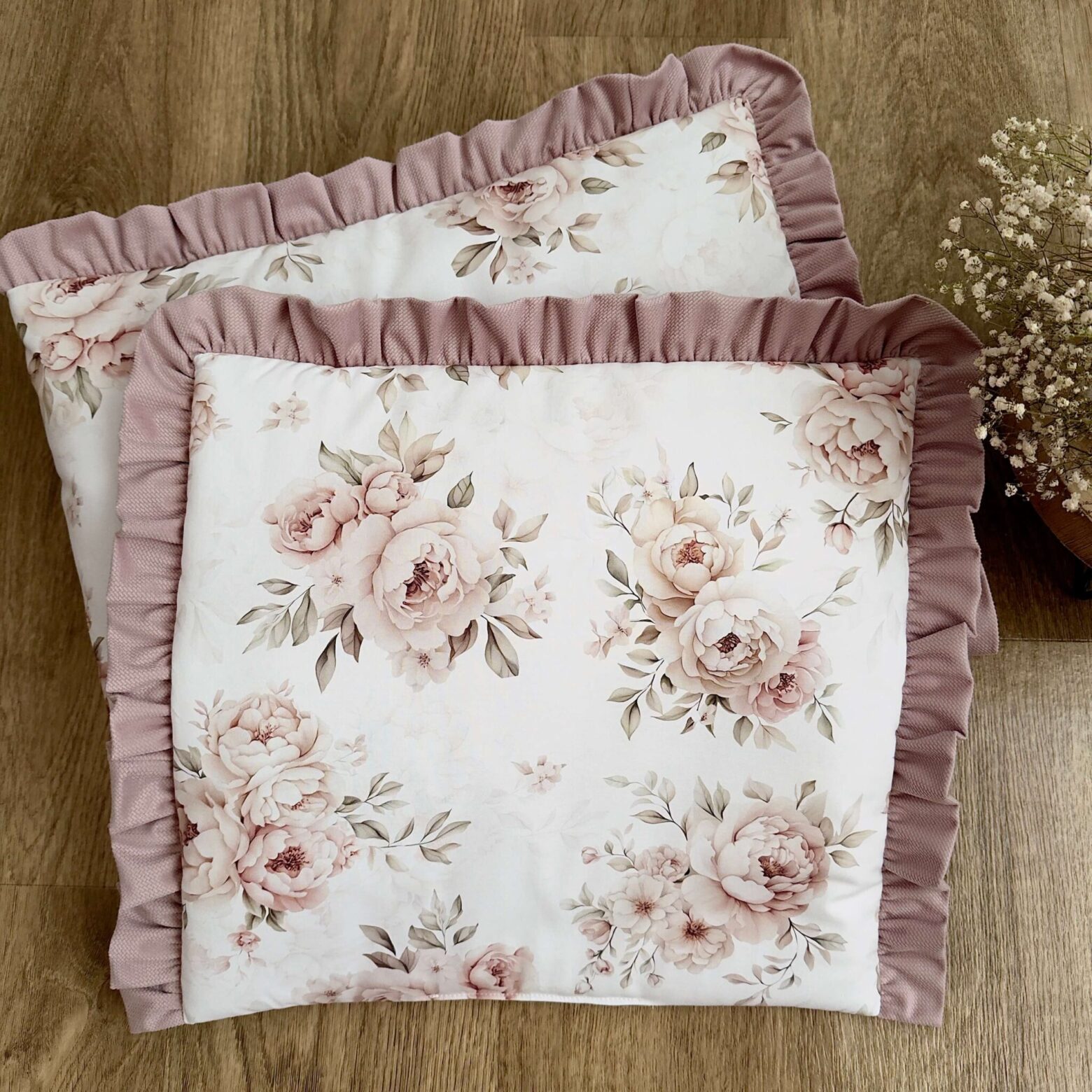 Kołderka + poduszka z wypełnieniem. Kolekcja PIWONIE Z LISTKIEM + VELVET brudny róż