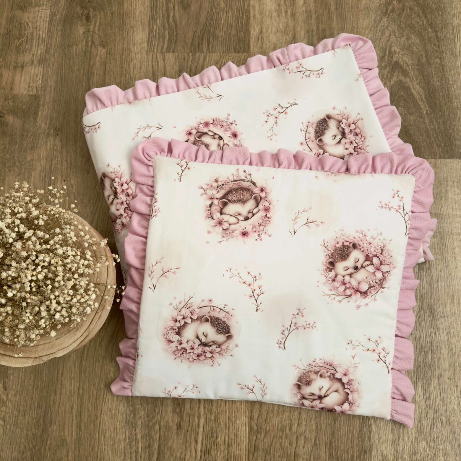 Kocyk + poduszka. Kolekcja ŚPIĄCE JEŻYKI + VELVET róż