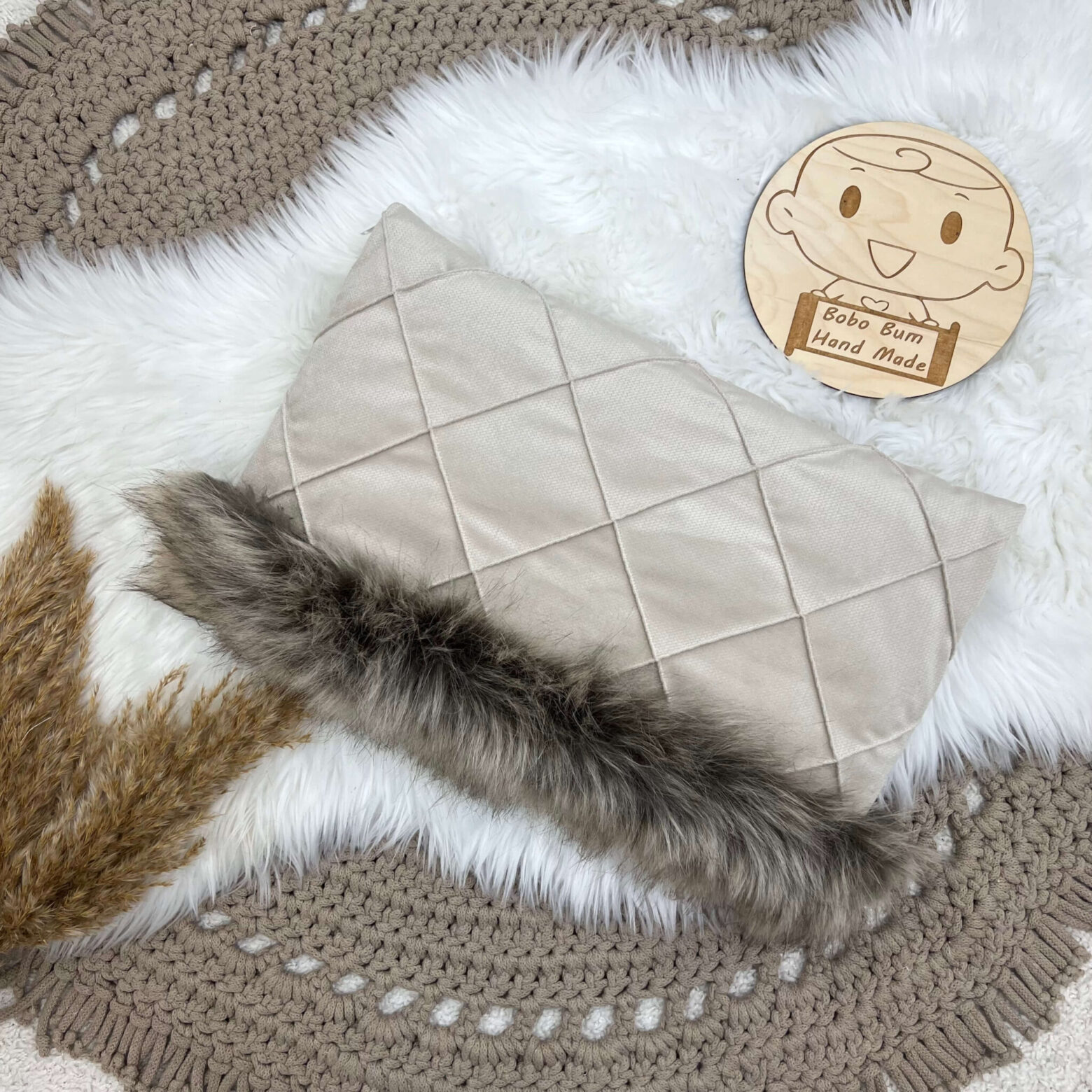 Mufka wykonana w całości z mięciutkiego VELVETU . Wypełnienie mufki to włóknina silikonowana o gramaturze 300g/m2. Dodatkowego uroku i ciepła dodaje wszyte futerko.