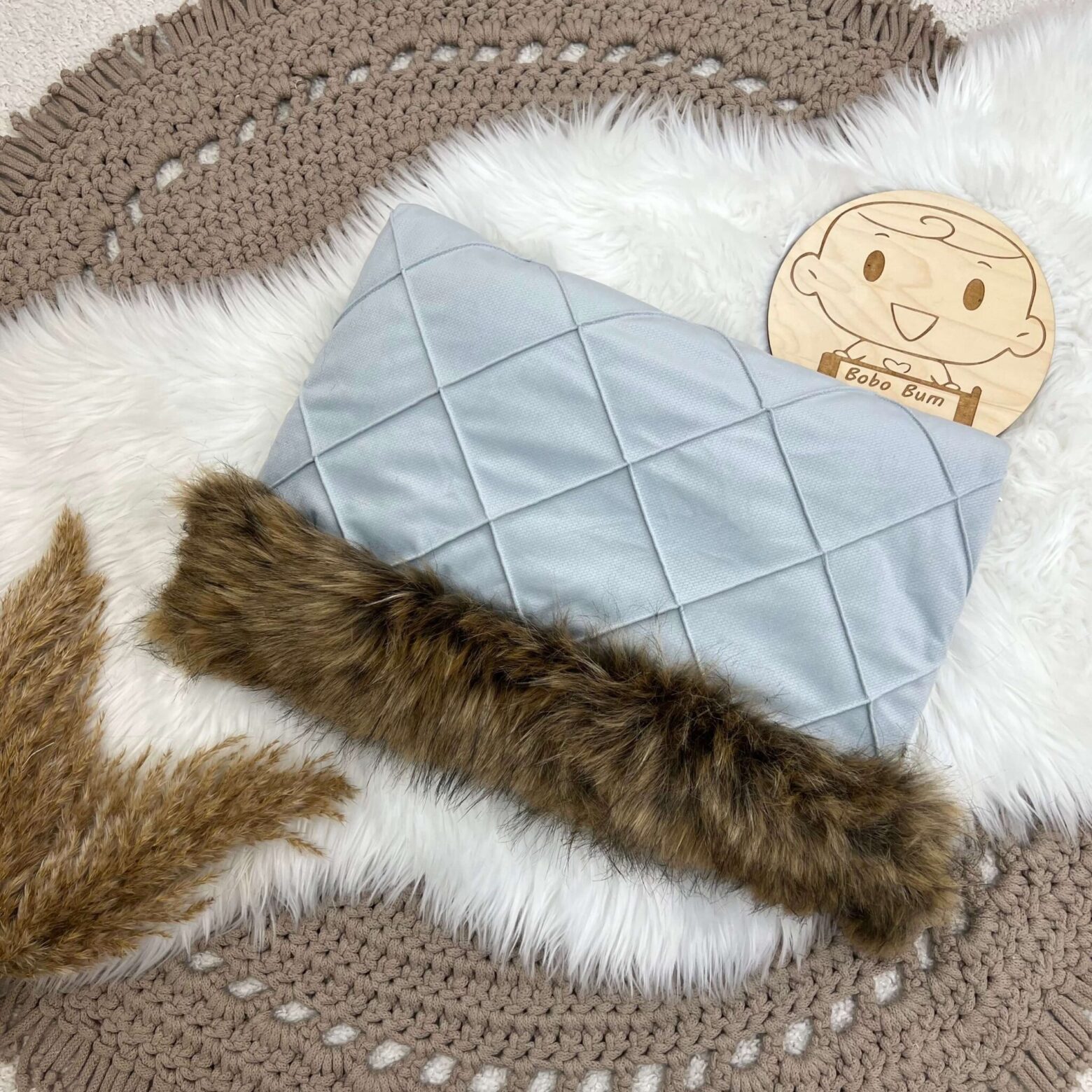 Mufka wykonana w całości z mięciutkiego VELVETU . Wypełnienie mufki to włóknina silikonowana o gramaturze 300g/m2. Dodatkowego uroku i ciepła dodaje wszyte futerko.