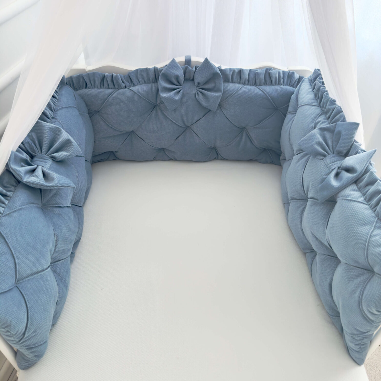 Ochraniacz pikowany- wykonany ręcznie, z najwyższej jakości materiałów z certyfikatami Oeko-Tex Standard 100. Ochraniacz ma za zadanie zapewnić maleństwu bezpieczeństwo podczas snu, a także pełnić funkcję wyjątkowego zdobienia łóżeczka oraz całego pokoiku.