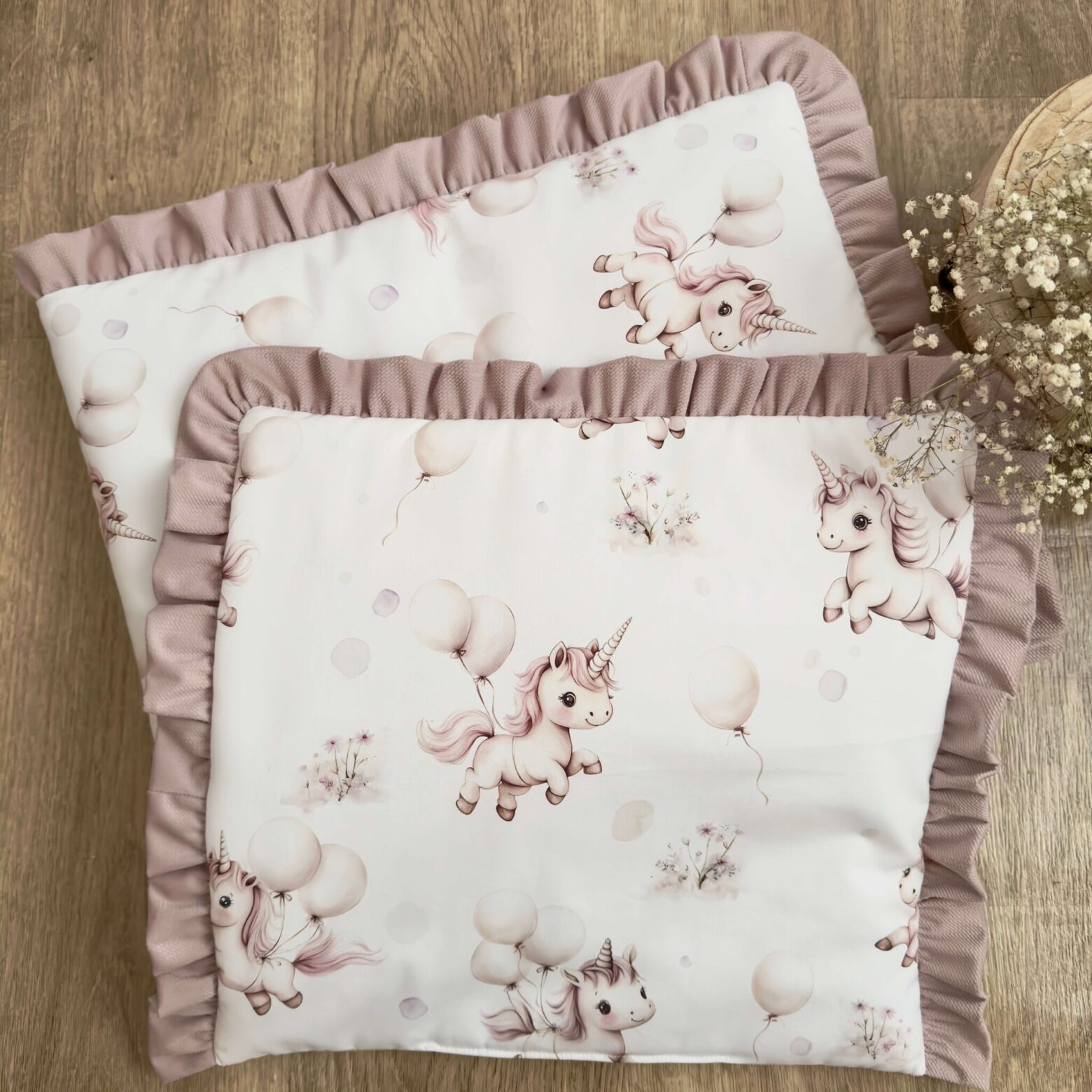 Kołderka + poduszka z wypełnieniem. Kolekcja JEDNOROŻEC Z BALONEM + VELVET brudny róż