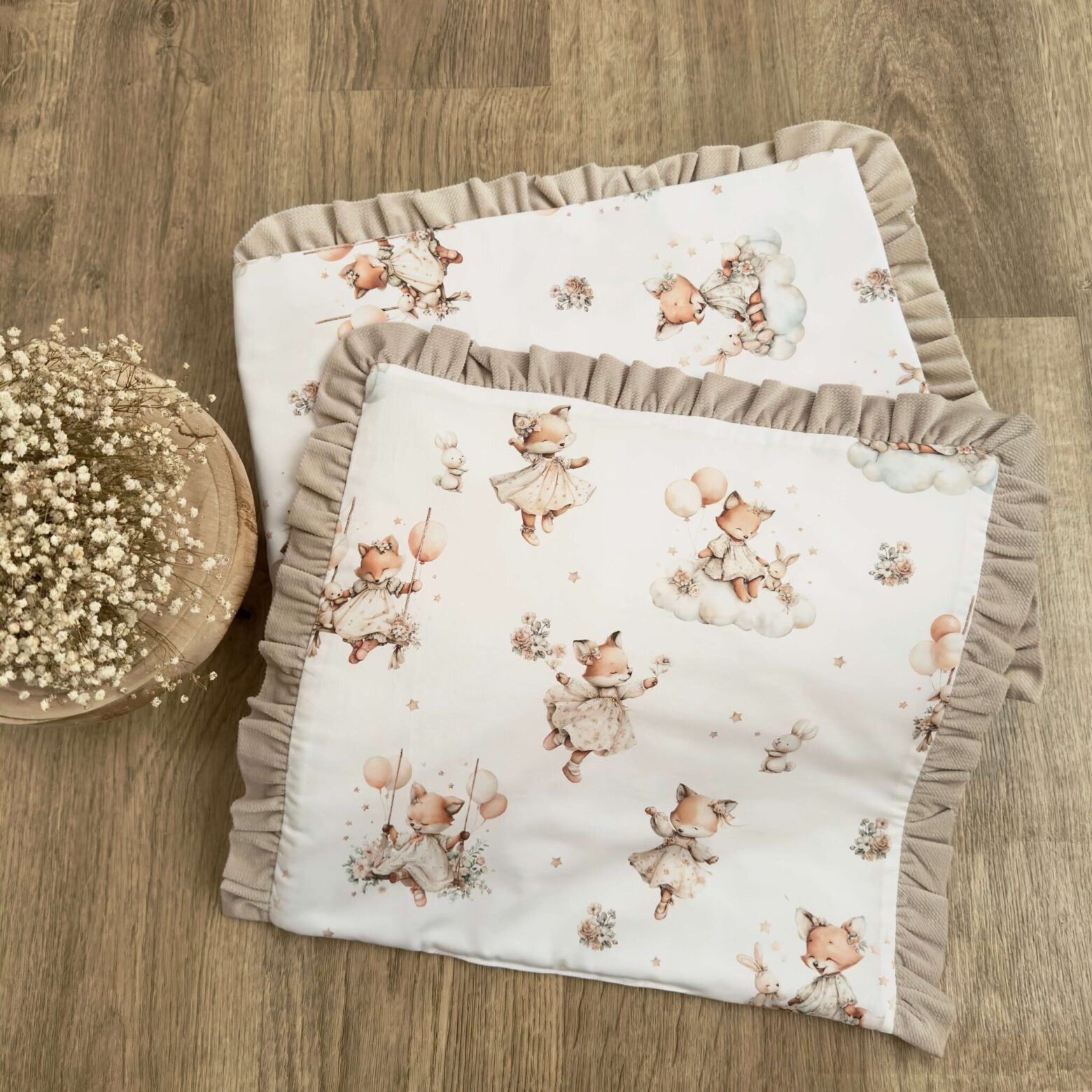 Kołderka + poduszka z wypełnieniem. Kolekcja WESOŁE LISKI + VELVET beż