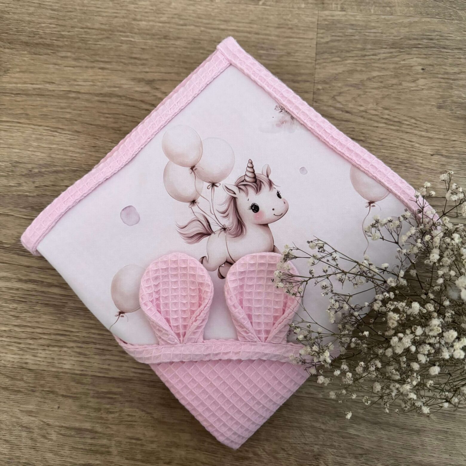 Napisz pierwszą opinię o „Ręcznik niemowlęcy JEDNOROŻEC Z BALONEM + WAFEL róż”