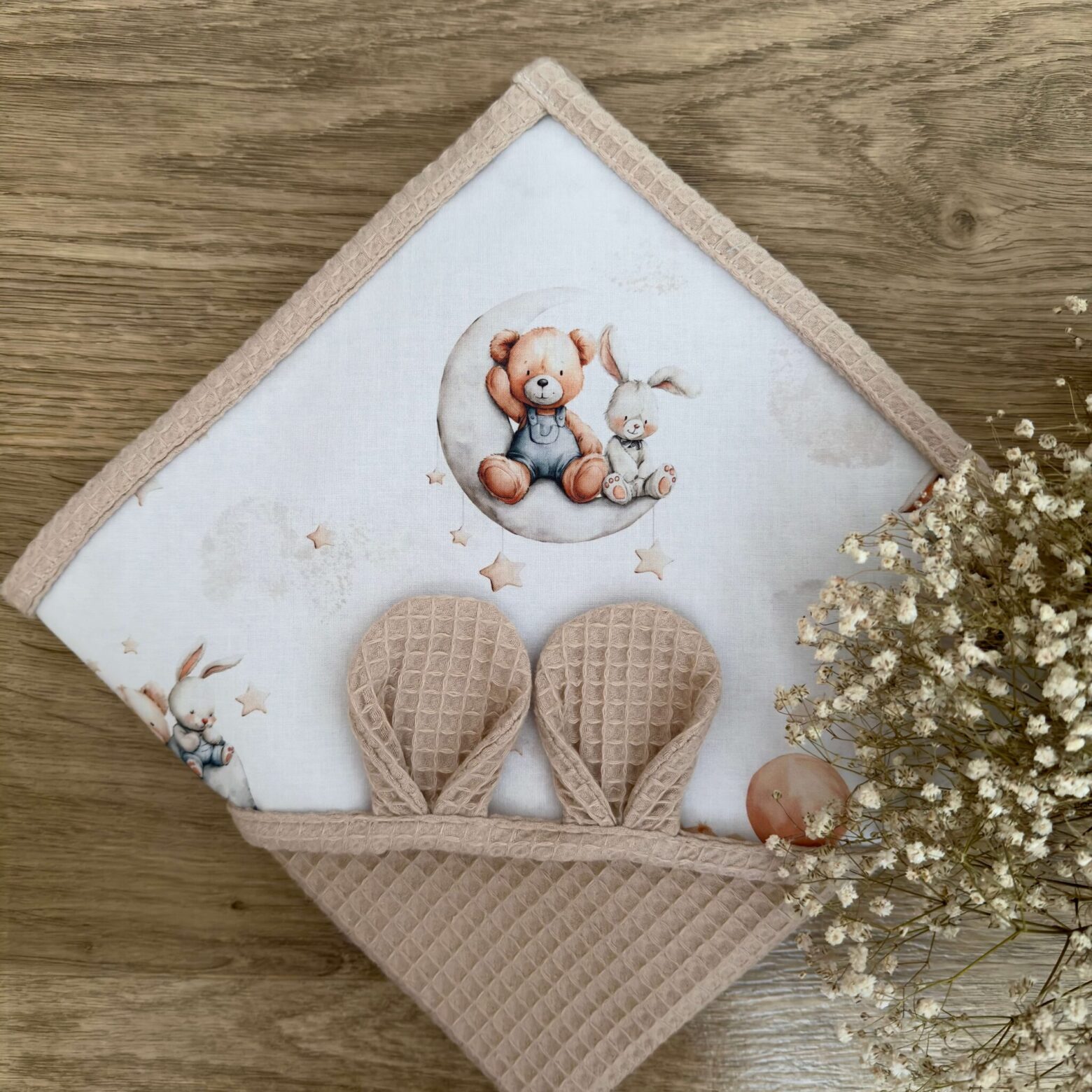Napisz pierwszą opinię o „Ręcznik niemowlęcy KSIĘŻYCOWE PRZYTULANKI + WAFEL beż”