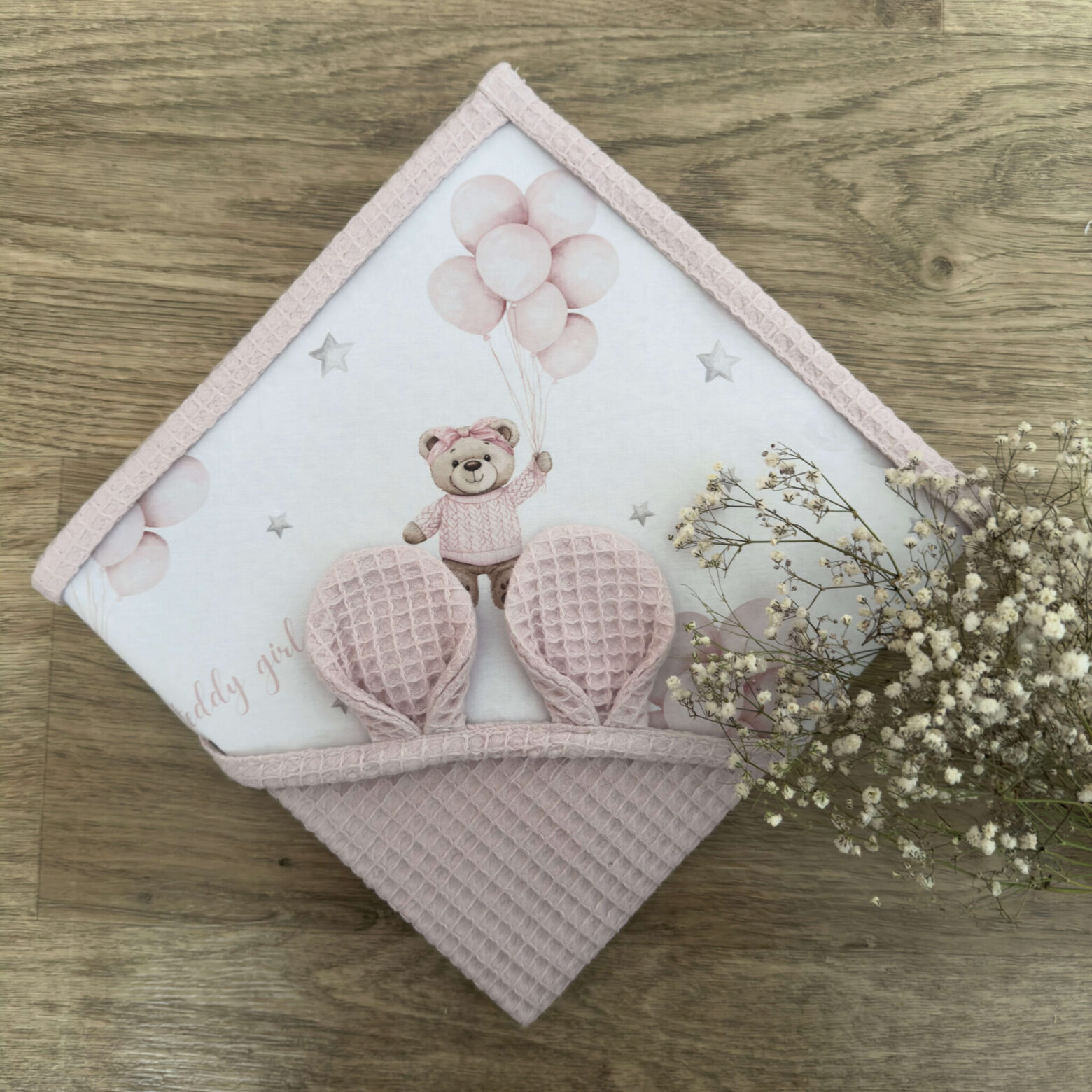 Napisz pierwszą opinię o „Ręcznik niemowlęcy MIŚ TEDDY balony różowe + WAFEL pudrowy brudny róż”