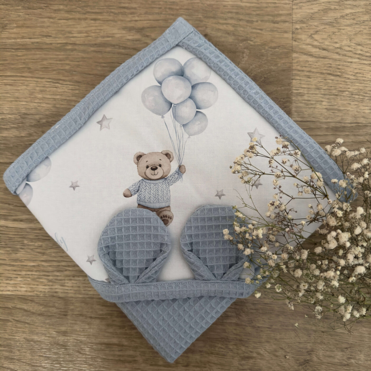 Napisz pierwszą opinię o „Ręcznik niemowlęcy MIŚ TEDDY balony niebieskie + WAFEL jeans”