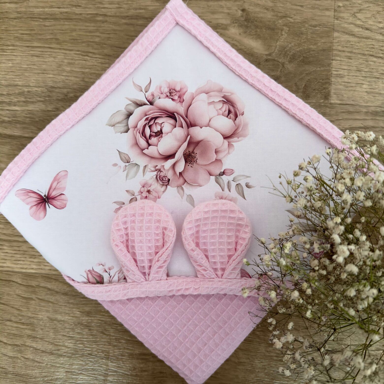 Ręcznik niemowlęcy PIWONIE Z MOTYLKIEM + WAFEL róż Darmowa dostawa od 500 zł! Ręcznik niemowlęcy PIWONIE Z MOTYLKIEM + WAFEL róż
