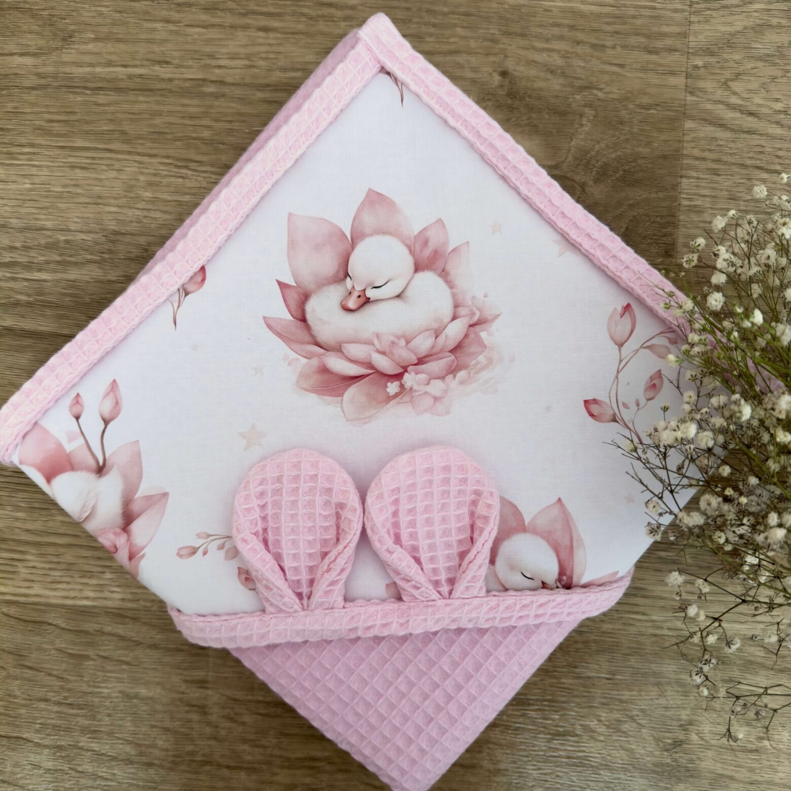 A wyjątkowa struktura przypominająca wyglądem wafelek sprawi, że maluszek nie tylko będzie dokładnie wysuszony, ale również zachwyci on wszystkich swoim uroczym odzieniem :).