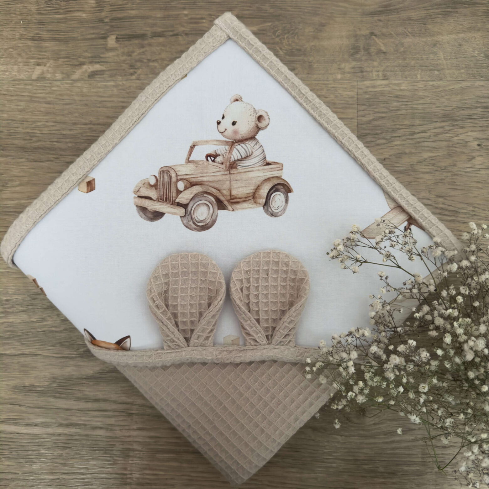 Ręcznik niemowlęcy DREWNIANE POJAZDY + WAFEL beż Darmowa dostawa od 500 zł! Ręcznik niemowlęcy DREWNIANE POJAZDY + WAFEL beż