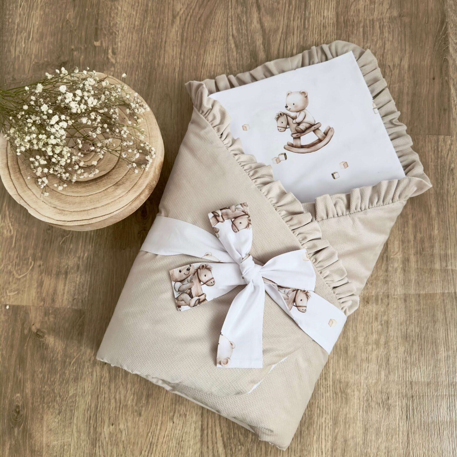Kołderka + poduszka z wypełnieniem. Kolekcja KONIK NA BIEGUNACH + VELVET beż