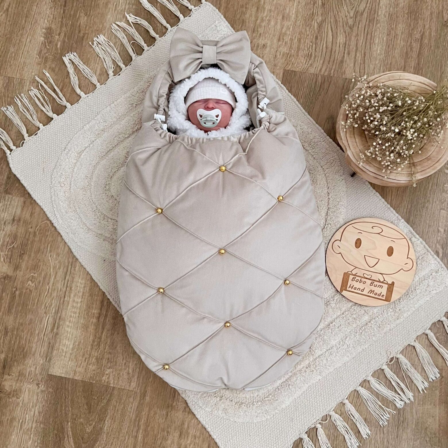 Śpiworek do gondoli pikowany VELVET beż + złote guziki + kokarda Darmowa dostawa od 500 zł! Śpiworek do gondoli pikowany VELVET beż + złote guziki + kokarda