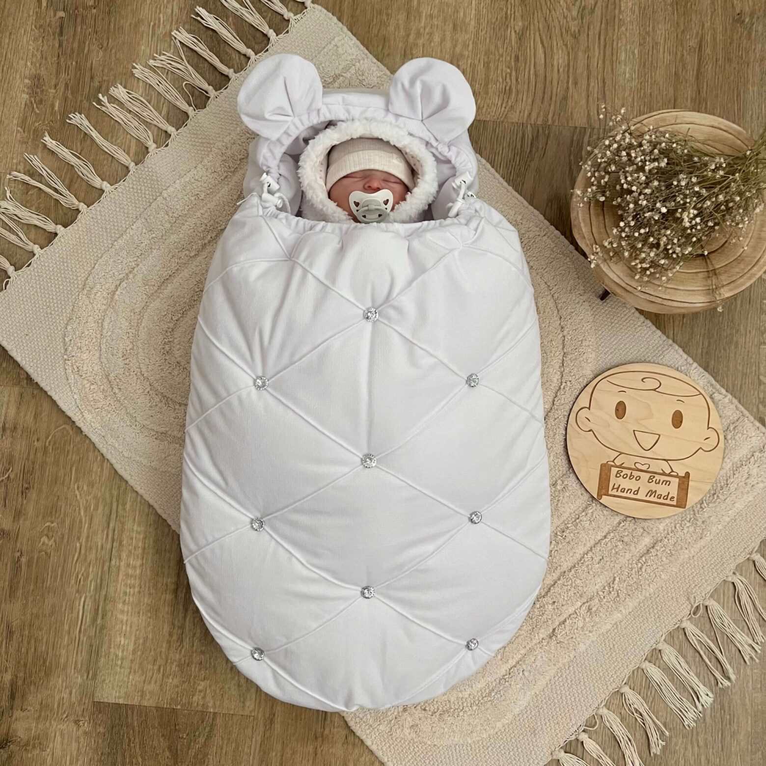 Śpiworek do gondoli pikowany VELVET biały + diamenciki + uszka