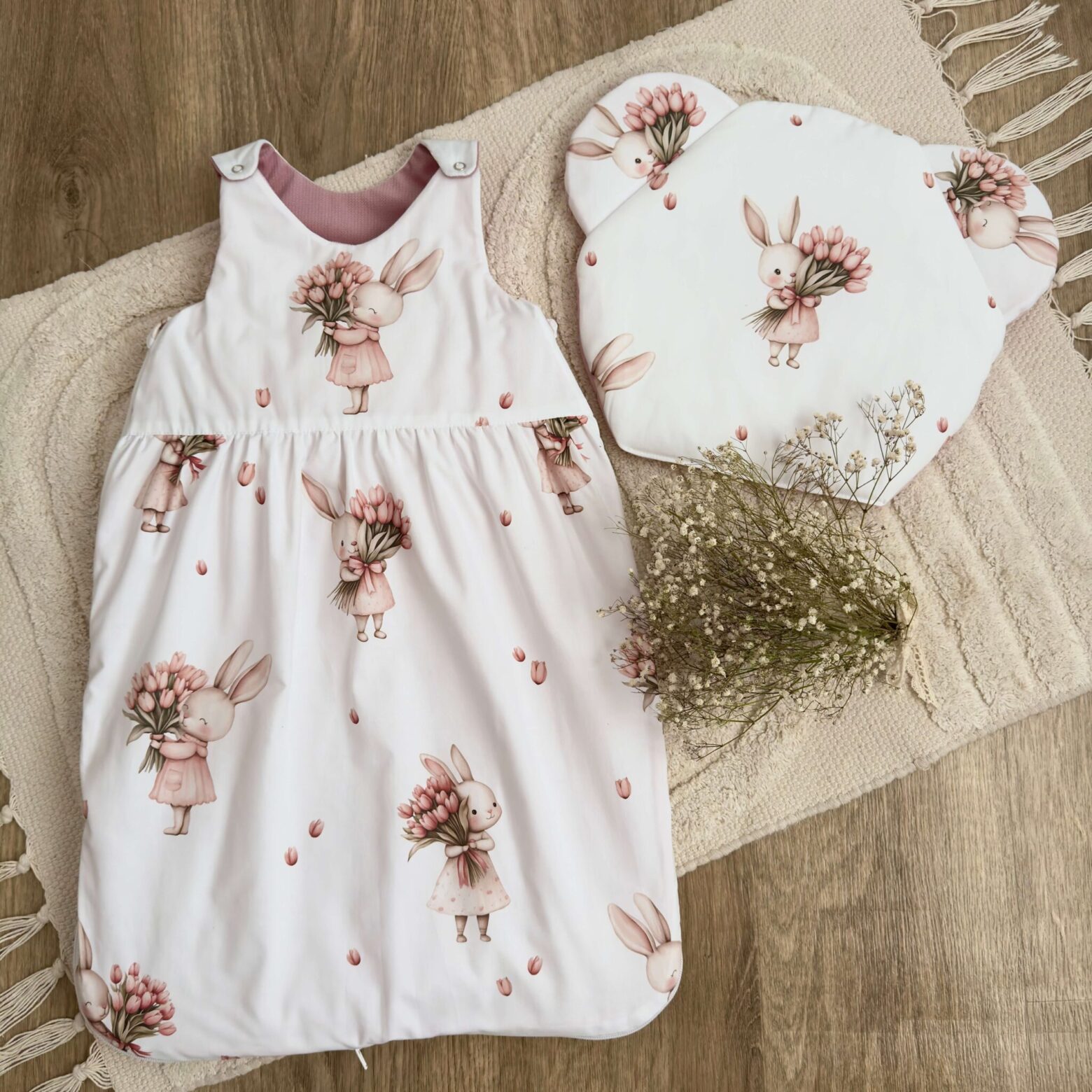 Śpiworek do spania kolekcja KRÓLICZEK Z TULIPANEM + VELVET brudny róż + poduszka GRATIS
