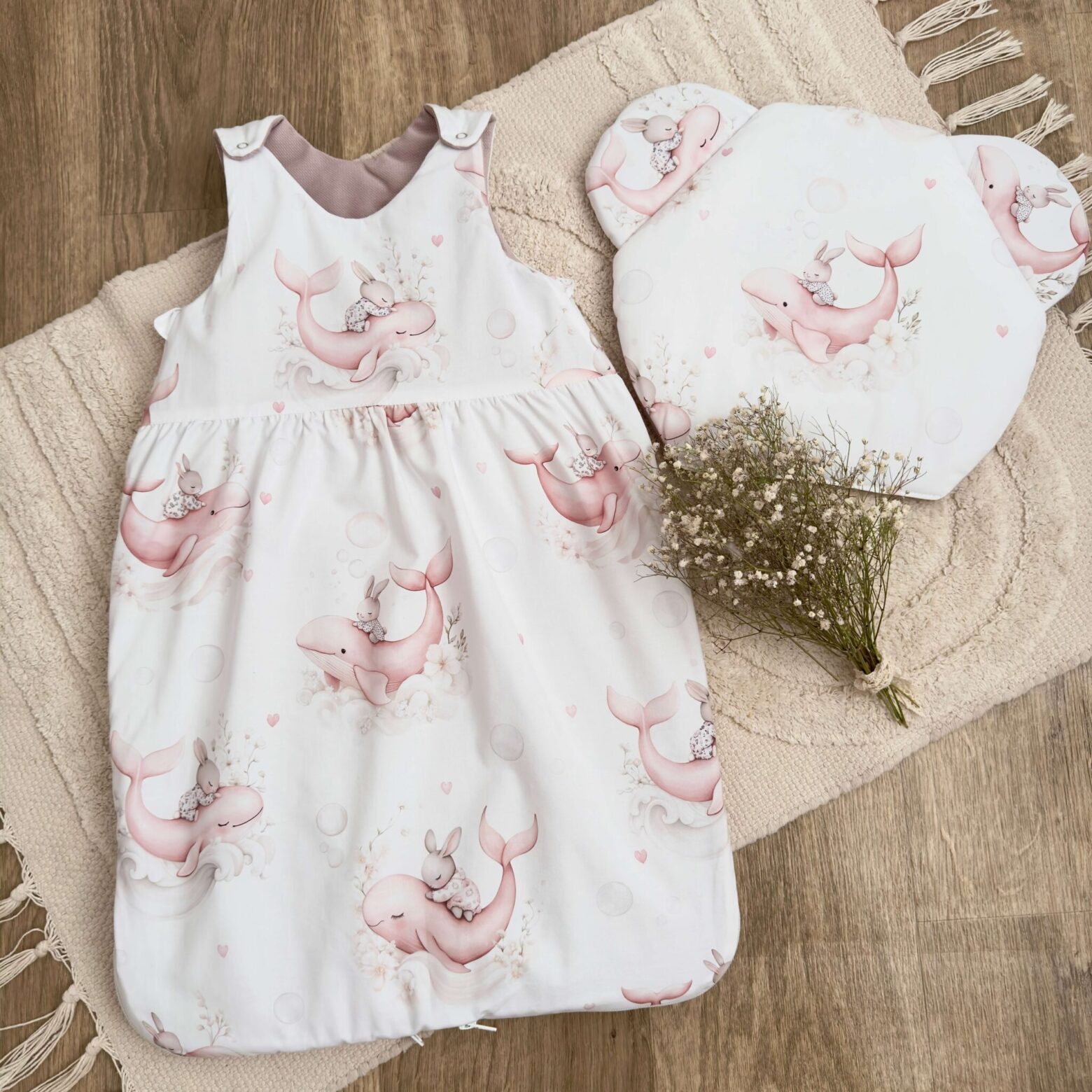 Kołderka + poduszka z wypełnieniem. Kolekcja SŁODKI WIELORYB + VELVET brudny róż