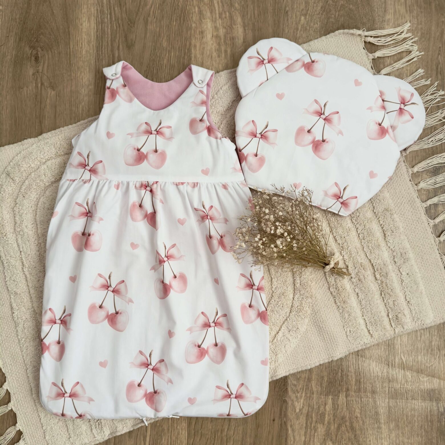 Kołderka + poduszka z wypełnieniem. Kolekcja WISIENKI + VELVET róż